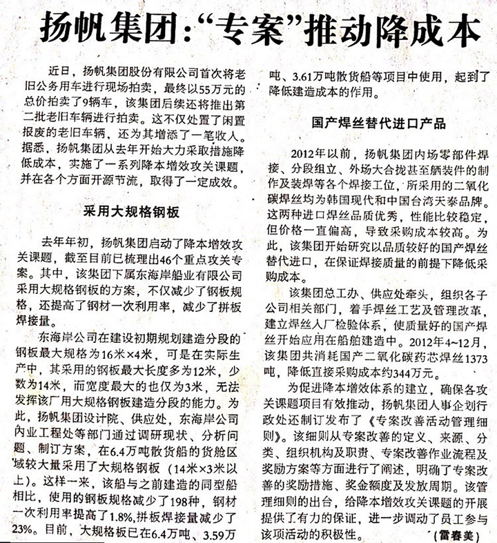 《中國船舶報(bào)》第39期:揚(yáng)帆集團(tuán):“專案”推動